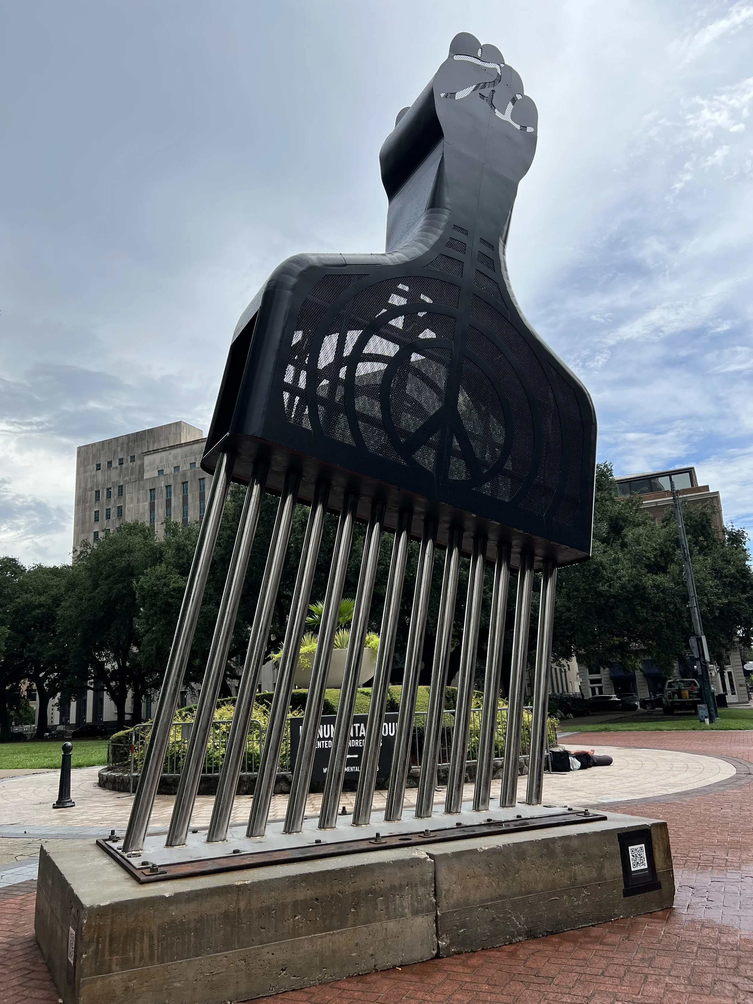 "Monumental Tour" director Marsha Reid, who chose the location, said that in many ways, Gallier Hall, located across the street from the sculpture, is the perfect backdrop. It is the old City Hall, which was finished in the 1850s and undoubtedly built with slave labor. “The origin of the Afro pick dates back to the time of ancient Egyptians as an article of status and cultural belonging. The clenched black fist comb in particular is associated with the 1970s Black Power Movement. As an accessory of a hairstyle, it represented counterculture and civil rights during one of the most important eras of American history. It exists today as many things to different people; it is worn as adornment, a political emblem, and signature of collective identity. The Afro pick continues to develop itself as a testament to innovation.”