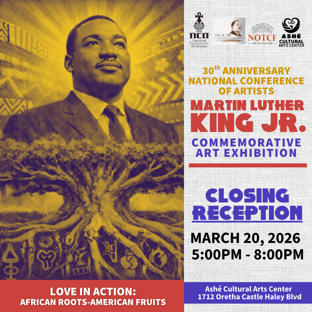 The MLK Commemorative Art Exhibition (MLK Exhibit) celebrates the life and legacy of Reverend Dr. Martin Luther King Jr., the Civil Rights Movement, and those working to further peace and human understanding. Through the arts and related educational and cultural activities, it gives recognition to people around the world who work tirelessly to fight for peace, justice, and responsible environmental cohabitation. The exhibition is a partnership between the National Conference of Artists, Ashé Cultural Arts Center, New Orleans Martin Luther King Jr. Exhibition Council, and the New Orleans Tourism and Cultural Foundation.