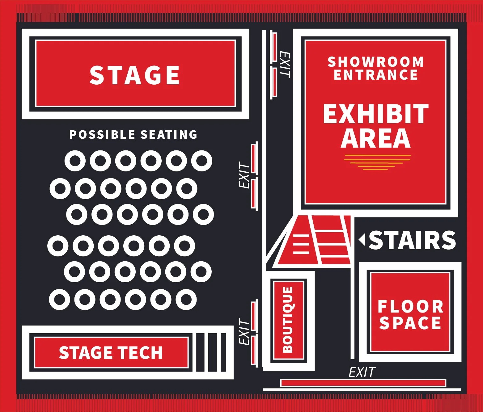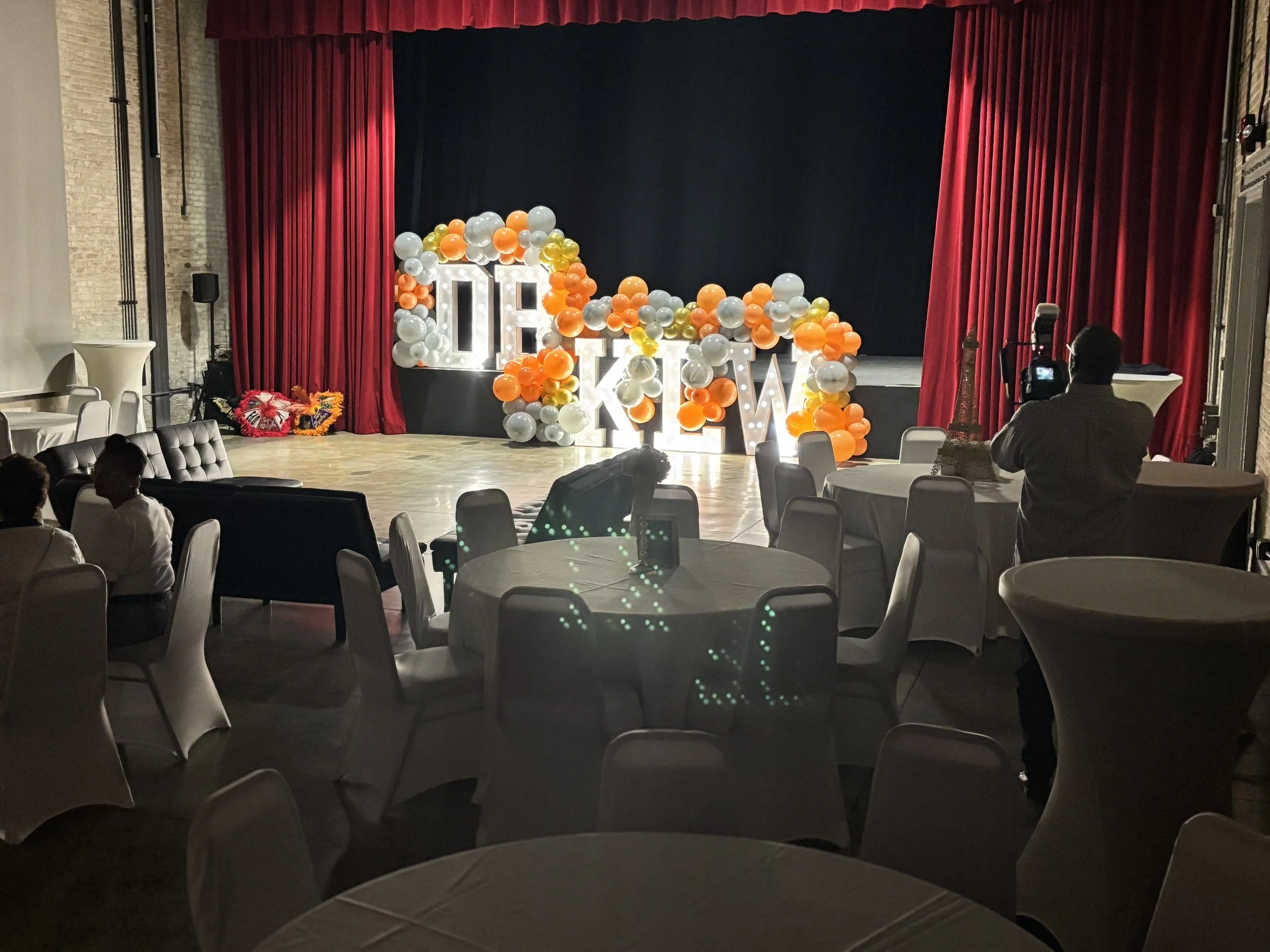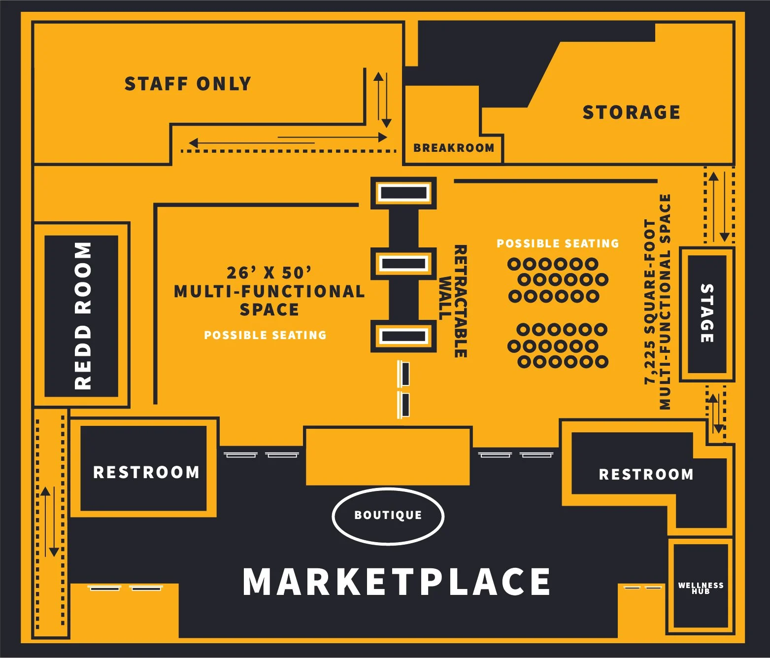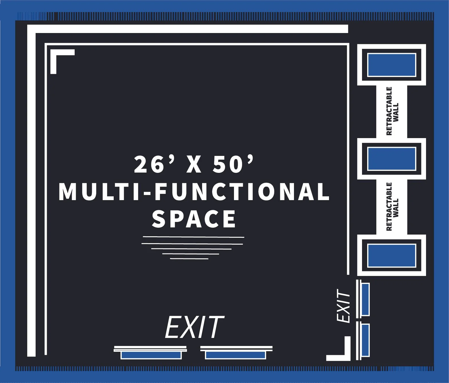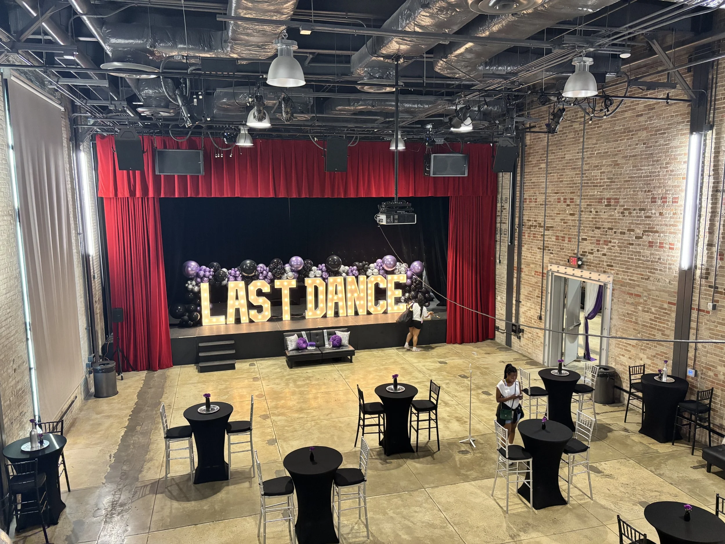 A 26’ x 50’ multi-functional space with a 24’ x 24’ stage and audio/visual, sound, and lighting equipment.